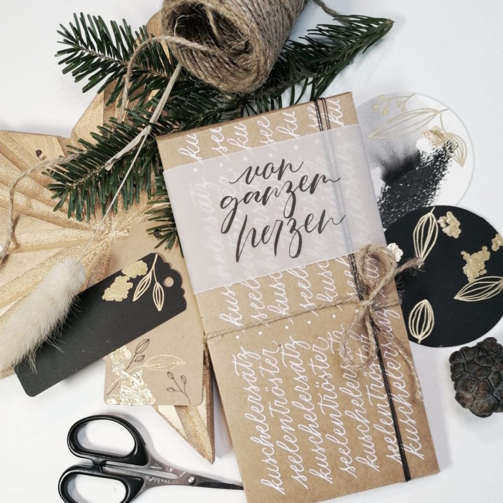 Die Breite der Banderole kannst du frei wählen. Ich reiße die Kanten immer über ein Lineal, damit es mehr DIY-Charakter bekommt. Verwende zum Schreiben hier einen kleinen Brushpen in schwarz. Beachte, dass Transparentpapier länger zum Trocknen braucht. -