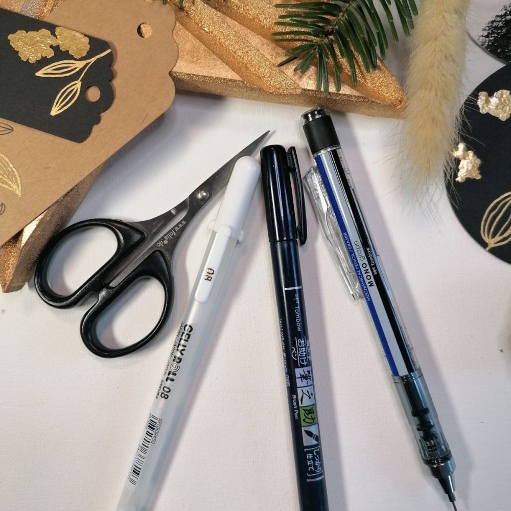 Um es nicht unnötig kompliziert zu machen, wähle einen kontrastreichen Gelstift zum Papier. Gelstifte haben die Eigenschaft nicht in das Papier einzusinken und stehen somit „erhaben“ auf dem Papier. Dieses kleine Detail lässt es sofort hochwertiger aussehen. Gelstifte gibt es in zig Farben. Probiere dich durch – hier gibt es nicht die EINE Marke. -