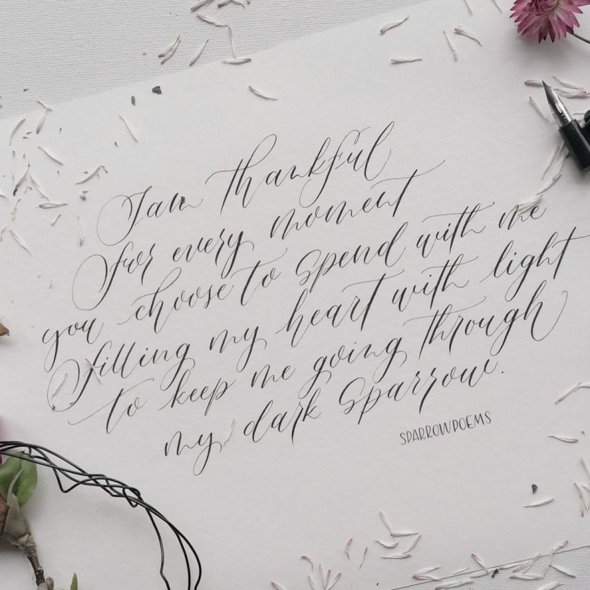Ich möchte Euch mit meiner Be­geis­te­rung für Schrift und Farbe anstecken, euch ermutigen eure eigene Kreativität zum Leben zu erwecken, um selbst kleine Kunstwerke zu erschaffen. Meine Liebe zum Hand­ge­schriebenen setze ich für deine spannenden Projekte ein, um dir ein Lächeln auf die Lippen zu zaubern.